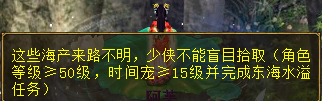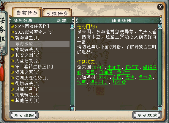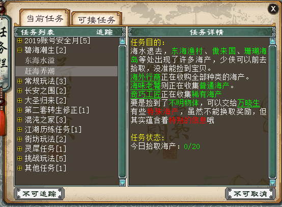 【碧海潮生】 活动时间:2019年3月8日10:05-3月31日23:59 活动要求:人物≥30级、时间宠≥10级、单人 东海水溢:在2个场景各找任意4个NPC对话,了解意象发生时的情况。 傲来国:小龙王-蝴蝶妹妹-虾将军-黄哥-龟学士-守禅僧 东海渔村:庙祝-大侠-鱼老头-乞丐-渔村村长-张小虎 赶海弄潮:完成“东海水溢”人物,获得物品“百宝鱼篓”道具再到东海渔村 傲来国 珊瑚海岛场景拾取各种海产物,每人每天最多拾取20个海产,再将海产交给相应NPC 解说:这个活动开展到3月底,活动方式比较简单,在傲来国和东海渔村各找4个对应的NPC就可以去东海渔村、傲来国、珊瑚海岛三个场景捡海产物交给NPC,不过海产物的数量很少,奖励方面还需要慢慢探索!下面我们来看看整个活动流程! 图文流程: 任务提示找2个场景对应的NPC,共计8个NPC