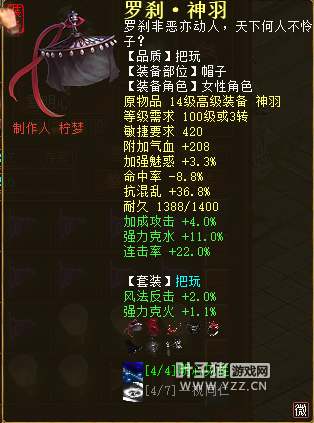 魔族: 抽魔的话就很飘忽不定了,我朋友忽视5克150的魔都能去杀了,不过建议还是以忽视10这个为标准吧,低点无所谓,克补回来,克火队忽视8克250起,非克火队忽视10克180起。因为怪抗了的震慑气血,同时也是高抗抽的,如果忽视低了,更抽得少了,回合也会拖得更长。 然后混杀队,控制强的话(无任何增益站街就忽视40那种),抽魔吃忽视抽,控制不强的话,最少有一个魔吃怨气。 睡杀队,不打算强杀的话,建议抽魔都吃怨气,G好再开始杀。 最后建议有一个魔,弄一套连击装备,专门打气的。 最简单的搭配就是武器原始带连击率,6级无默契面具带连击率,连击率帽子,然后变个物理属性的迦楼罗王、金不换、范式之魂或颜如玉卡即可满足需求。我的的打气装备如下: