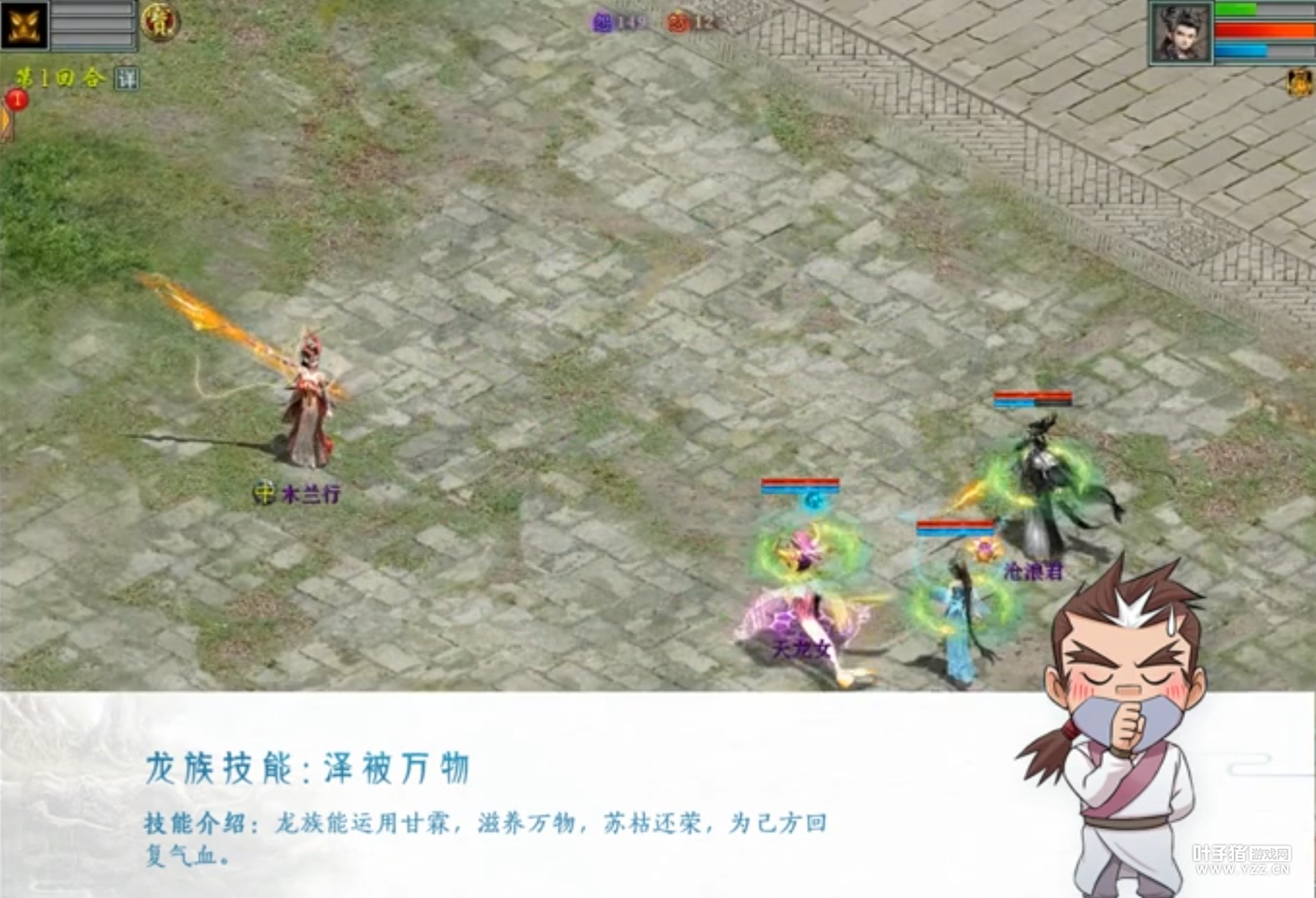 视频看到,倒地单位HP48432,倒地后回血14700,其他单位回多少没看到。如果这个回血是百分比回血,那这个应该是30%左右,不过看这个复活血量的数值感觉应该是回具体数值的血量。如果未倒地单位回血多点还好,回血少的话,下回合灵宝、悬刃、遗患什么的估计都够喝一壶,中毒的话更是可能直接倒地,白放一个甘霖…… 第六、装备问题。按以往的装备强法规则,甘霖和霹雳都是通用技能,这样的话估计除了六阶,龙族是无法同时强两种技能的,而且扶摇和沧波从演示视频可以看到,伤害比霹雳要少很多的,所以龙族可能会有主秒和主回的方向,目测还是主秒的多,威胁不了男鬼的地位。 看完这个,是否有人觉得甘霖不如三尸回血?那我给大家举一个例子,天勇星! 目前比较常用的杀法,是利用百害不侵以及回光返照的套装技能,这种已经有比较成熟的杀法,具体就不展开了。我们来简单聊一下,使用甘霖杀天勇星! 首先,人物带低敏定力宝宝,上个高敏龙和高敏男魔,第一回合男魔提速,让敏龙和魔能比对面快!然后龙族上甘霖法术,只要不是全部灭门,上了甘霖的单位,下回合就会都站起来!然后龙族继续上甘霖,另外的存活单位拉人招宝宝或直接上百害不侵保住一个单位。撑到龙族能开逆鳞,连倒地单位都能拉起来。所以后续杀天勇,带个龙族,能非常简单击杀了。 另外,因为是状态性法术,只要持续给容易倒地的单位使用,那么也不怕出现灭门情况,下回合依旧能出手!除非灭门的优先级在甘霖之前。 以上是本人关于甘霖技能的一些拙见,有不成熟的地方,望轻喷。另外,“甘霖瑞雪”是回血法,现在“甘霖”的回血有了,啥时候来个持续回蓝的“瑞雪”啊 [编辑:枫花]