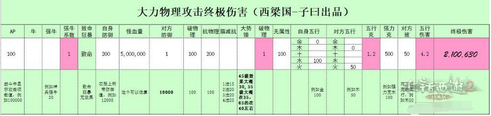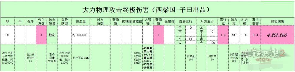 物理伤害=(AP*1.5+对方点前血量*10%)* 五行加成 * 强力克加成 * 忽视抗性加成。众所周知,为了限制龙族,龙族法术物理攻击,攻击加成只有34%。 但是强力克500,遇到致命伤害,即使你只有100点攻击力,伤害也是巨大的。到底有多大,请看下边讲解。 假如:自身攻击力为300,水100,强力克500,致命100,破物理程度和几率都是100。怪有500万血,上克后,五行火50 龙族伤害=(300*0.34*1.5+500万*10)*1.2*(1+500/100*50/100)*1=2100642.6=210万。 总结,当强力克达到500点后,即使攻击力为100,也可以打掉怪的一半血。 同理,如果怪是火100属性。那么100点攻击力,可以直接秒杀怪。龙族伤害=(300*0.34*1.5+500万*10)*1.4*(1+500/100*100/100)*1=4200000=420万。 总结,当克火遇到完克,可以直接秒杀! [编辑:蒲天初]