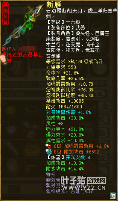 从这几张伤害图可以看出,这位龙族的输出并不算非常的爆炸,但在队伍当中作为一个火力单位,已经足够完成自己的任务了,而他的配装,仅仅花费在3000元左右,下面来看看这一套配装的全部展示: 龙族由于新鲜出炉,各项装备比较稀缺和紧俏也是常理,所以这把武器算不上完美,但售价仅仅在100-150元,根据龙族属性的重要性排序,双破数据尚可且加成够高,总体性价比就非常不错了: 项链用了一条高克的,这类项链根据五行的不同,价格相差也较大,不过类似以下这条也就在100元上下: 帽子和衣服,如果自己买成品的话的确比较贵,而自己打造加上稍稍炼化会更加省钱一些,如这位龙族的帽子衣服就是自己砸的,每件仅仅几十元: 这里要补充一点,想要命中达标的话,主要来自三个方面:武器、衣服、护身符,武器和护身符所带的命中均在20+这个比较固定的范围,所以衣服上的命中就尤为重要,越高越好。