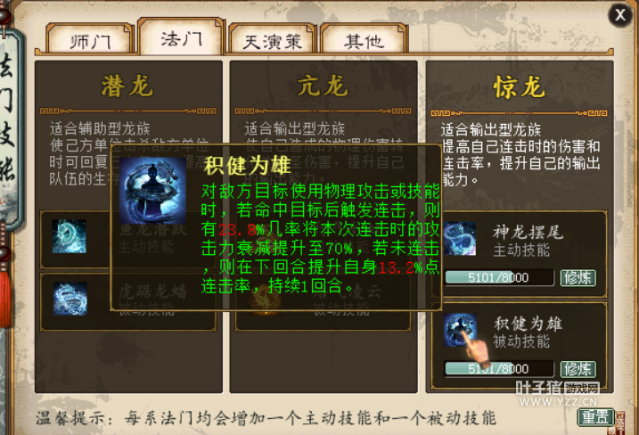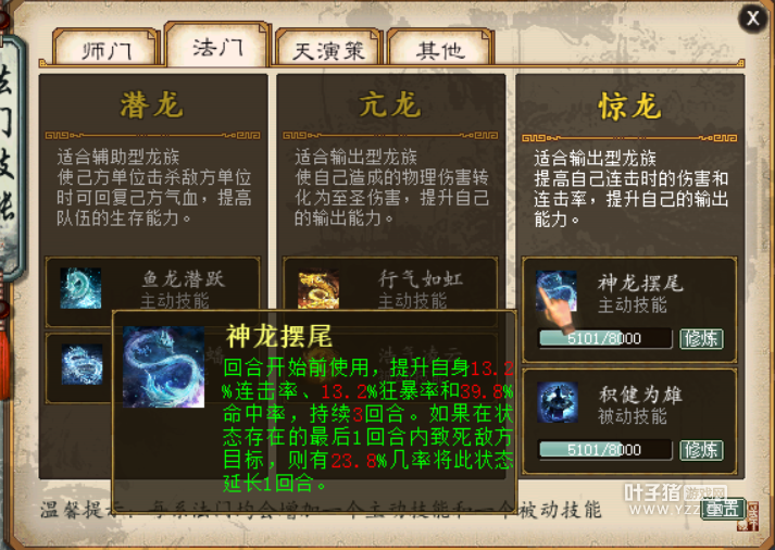 龙族登陆正式服已经半月有余,大家对这个种族的实力和属性都有了一定的了解,但大多数玩家在实际打造中还是处在摸着石头过河的阶段,导致每个人手中的龙族甚至有“不是一个种族”的差异感。 今天要为大家分享的,就是关于龙族天赋法门的详细解读内容,如何找准自己的定位,如何选择最合适的法门天赋,您手中的龙族就将迸发出截然不同的威力。 霹雳系 最常用的输出系天赋 先说天赋方面,作为龙族的主力输出技能,目前绝大多数玩家也会选择霹雳系天赋,这一系天赋对于辅助输出的构成因素来源于多个方面,例如硬性命中提升,来自击电奔星技能: 又如奔雷疾电,作用在于几率性无视对方躲闪,对于很吃命中的龙族来说,等同于间接性的增加伤害: 而最为核心的还是大招“轰雷掣电”,这不仅是一个稳定增伤的技能,还是一个调节自身数据的技能,如为了提敏,舍弃部分力量,战斗中通过击杀单位弥补攻击数据。越到后期输出越高,PVP战斗中到30回合之后,提升了6万点攻击力后的伤害对于敌人来说就是毁灭性的打击。 如果定位在只是日常任务,或是PK当中取代仙族的火力单位,霹雳一系都是很好的选择,但除了这两类情况之外,其余的天赋或有更加出人意料的效果。 扶摇系 核心大招决定定位 扶摇系法术的效果为降低敌方血量及上限,所以这一系的天赋也是围绕此目标进行,最为核心的就是大招“气贯碧霄”的效果。 能够直接将目标单位变为3万血的脆皮,这个技能虽然修改为只在玩家之间生效(已经非常恐怖了,对怪物的话就太夸张,这一点设定很合理),但作为一系大招来说已经非常合格了,敏队在打血队时面对一些血鬼守中男之类的单位,这个大招简直就是终结利器。 挥毫回锋和摇山震岳两个技能也非常实用,两次伤害和无视躲闪金刚的效果在PVP中能有奇效,点满后40%的几率也算是很高了。 至于骤风惊雨和踏空裂云,增加伤害和命中都是很直接的属性,这一点上无需纠结,只是需要再两系下一个技能上做抉择,就目前来看月晕知风的效果要优于啸动山林: 选择扶摇这一系,大多还是根据自己队伍的定位,虽然日常的大多场合不如霹雳来得直接,但从某些特定场合来说,扶摇的能力无可取代。 沧波系 肉体和精神的双重折磨 沧波系的技能效果在于降低敌方的物理法术命中率,选择这一系天赋的女龙,在队伍中的定位可以作为一名纯输出,也可以作为一个功能型的单位,血打敏时收效甚佳。 核心大招“惊涛断浪”,将女龙技能的特性发挥到极致,技能降低敌方的命中,大招再增加己方的法术躲闪,双重效果带来的就是秒不到、砍不中、控不上,再加上技能的伤害,无论从哪个方面看,女龙都是个极其令人头疼的角色: 除了核心大招外,沧波系天赋其他的效果也非常可观,例如浪遏飞舟,虽然只有5%的几率,但无法获得攻速的状态还是会令对手很难受: 而雾锁横江的效果甚至称得上“恶心”,有种无论如何都甩不掉沧波效果的感觉,召唤兽离场时还有几率将负面buff转移到主人身上,这样的高传染性能够持续给对手造成心理负担: 总体来说,沧波系的技能不仅仅是对敌人带来肉体伤害,心灵上的折磨甚至更严重,试想一场40-60回合的战斗,对手如果有女龙的话,相信无论哪支队伍的想法都是快点结束吧。 女龙之于血队的效果非常明显,未来或许会根据女龙的特性衍生出一种全新的血队打法,其实这样的打法已经有很多队伍在尝试了,只是缺一场大赛的历练来正名而已。 甘霖系 更符合奶妈的特性 虽然目前纯辅助的龙族少之又少,但甘霖这一系的天赋之强大还是不得不提,相对于其他几系来说,甘霖系的核心手段具有难以预测的多面性。 大招“沐雨经霜”,能够立即刷新友方大招,这就能给人带来无限的遐想了,顺风时用于仙族的大招输出,逆风时用于鬼族的大招救命,能够将整支队伍的灵活性与机动性提升一个台阶: 另一个大招“震风陵雨”,给8个单位添加甘霖效果,配合逆鳞特性的话,能够在一回合之后造成绝境逢生的效果,单从回复效果上来说,这个大招的作用无出其右: 当然,星离雨散和春盈四海这些技能的效果也同样出色,能够令队友摆脱尴尬的处境或是挣脱被针对的命运,相对于男鬼,辅助龙甚至更符合“奶妈”这个词的定义。 作为一个辅助角色,甘霖系天赋能给对手带来无从捉摸的感觉,就算己方的情况已经被对手摸得烂熟,但甘霖龙每一次登场后,到底是高效清场还是绝地逢生,这是对手绝对猜不到的。 说完龙族天赋门,下面来说说关于法门的选择。 龙族法门选择 惊亢潜三系出彩 龙族三系法门,两输出一辅助,作为目前最主流的输出型龙族来说,惊龙系是最佳的首选。 积健为雄的作用很直观,就是为了提升连击率而存在,所以非常契合霹雳的效果。 而神龙摆尾则是提升大力属性,其中最重要的是提升命中,这是让PVP和PVE中的龙族输出更加稳定。 而亢龙一系同样适合输出型龙族,这是让龙族的输出能力上一个台阶的存在。 至圣伤害在PK中的重要性无需赘言,而行气如虹的存在完全是为了浩气凌云能有更好的效果,伤害转化为不受任何环境影响的至圣伤害,对于敌人就是实打实的打击,同时再增加伤害的百分比,就给了龙族提高瞬间爆发伤害的能力。 辅助系潜龙法门无需多说,如果自身定位是辅助的话,这个法门是不二之选,杀人回血的效果在大话中还是首次出现,这个法门甚至能省下一