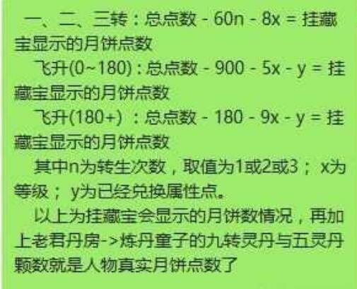 最近看到好多小伙伴不懂算自己号的月饼数🤔如果不知道什么是月饼🤤可以评论交流哈。我把一些准确的公式放上来给大家参照去计算,最终月饼数是要加上天上的才真实,一般卖号藏宝阁会帮忙计算,搜号时会显示负数也不需要惊讶😏你天上的点数没补,一般卖号时我天上是会去用丹灵引补满的,废(经)话(验)不多说,请看下面公式。 一、二、三转:总点数 - 60n - 8x = 挂藏宝显示的月饼点数 飞升(0~180) : 总点数 - 900 - 5x - y = 挂藏宝显示的月饼点数 飞升(180+) :总点数 - 180 - 9x - y = 挂藏宝显示的月饼点数 其中n为转生次数,取值为1或2或3; x为等级; y为已经兑换属性点。 以上为挂藏宝阁老玩家会这样去计算出月饼数情况,再加上老君丹房->炼丹童子的九转灵丹与五灵丹颗数就是人物真实月饼点数了。 以我的3转171女魔为例,总点数171x2+222+981=1545 1545-60x3-8x171=-3 这里怎么会是负3点,因为还要加上天上的九转灵丹与五灵丹颗数得-3+47+2=46点 以我飞升178男仙为例 总点数为:1133+178x4=1845 1845-900-5x178-11=44月饼 以我飞升182男魔为例 总点数为962+182x5=1872 1872-180-9x182-10=44 有人问月饼数多有什么用,我单孩子46月饼40天赋卖了1999