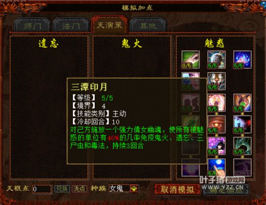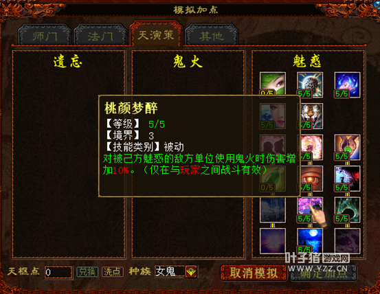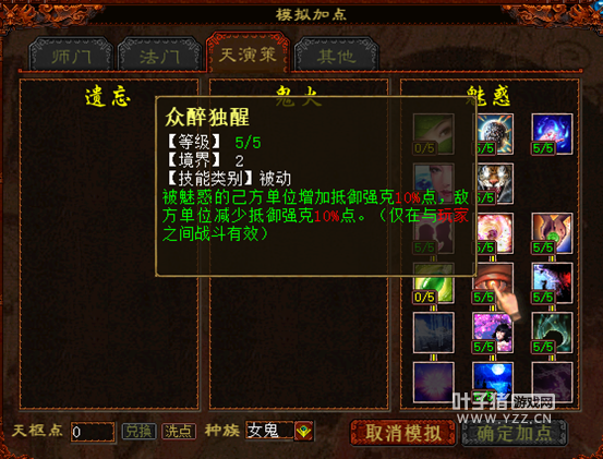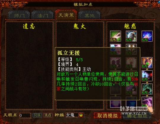 说完技能,我们接着来看关于天演策的改变,关于原“众醉独醒”、“桃颜梦醉”、“三潭印月”这三个技能的修改,基本都是基于原效果进行了加强或是能够对敌方使用,单看介绍就已经一目了然,这里就不作过多阐述,主要说说新技能“孤立无援”的作用。 孤立无援的出现取代了弱水三千,作用在于PVP战斗中控制单个目标使用,不能召唤和触发召唤兽闪现的设定看似非常简单,但在实际的战斗中却有不小的意义。 例如在敏队和血队的战斗中,守中或是铁鬼单位在一回合很难造成击杀,而首回合的舍生效果也即将失效时,敏女鬼上完魅惑之后完全可以用这个技能来控制重点单位,使对方的当头、化无、隐身等等战术宠不能登场,以便于顺利完成快速清场。 |