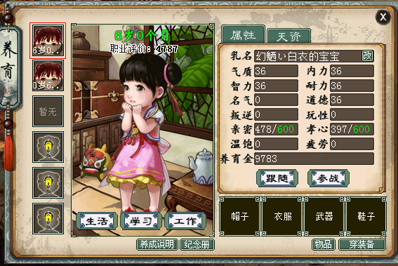 老版孩子神结局怎么养?每个老版孩子操作都是100%不一样的,所以我没出攻略,在此简单的给大家说下注意事项吧。 老版孩子出来都是六岁的,但是评价不同,所以初始养育金每个都不一样,这就是为什么老版孩子养育金有的高有的低的原因。 老版孩子6岁养育金最低3800,这种孩子就建议追道德了,可以把6属性都弄到1200这样比较好,最高初始养育金我见过10800的,初始养育金的计算公式[3800+(6000×初始评价÷4800)]。 ▲老孩子 现在就给大家说下老版孩子要多少道德的计算方法: 比如你初始养育金是9360,那么计算公式就是,(9360-2160)÷360×50=1000得出你的孩子要追多少道德,2160是新版孩子6岁的初始养育金,这样就是为什么新孩子不要道德的原因。 一次道德是遇到乞丐给他360养育金换取50道德左右(49-55之间波动)遇到乞丐的正常场景是7岁海边和8岁野外这两个场景不扣属性的只降低疲劳,正常的孩子以这个要1000道德为例子,去完海边和野外9岁正常有800左右的道德。 还差200等12岁再去黑市补即可,9岁就去新场景太医院降低疲劳比较好,但是有个别倒霉蛋的孩子在9岁前出现乞丐的几率太低只有500的道德。 9岁降低还得去野外弄到800左右后期黑市补个200。1岁12月但是它的12月是从0-11月共12个月,一个月有3次操作12个月就是36次操作6岁到17岁11月操作完结局为12年供给432次的操作。 介绍完这些开始进入操作步骤吧! 6岁开始去做家务(给叛逆扣气质所以这个第一做)到疲劳满(疲劳满是300,300以上打工学习都不可以但是可以去皇宫),然后去皇宫到7岁。 7岁后去海边到疲劳30左右低于30高于30的再去一次,遇到乞丐必须给钱!然后继续做家务到疲劳满,接着一次海边降低一次,继续家务这样循环到7岁11月如果疲劳满的去海边降低一次然后做家务到8岁即可,但是如果去一次做家务就疲劳满了就去一次皇宫这样保持疲劳满到8岁,如果是7岁11月疲劳没满就去做家务到疲劳满然后去皇宫到8岁即可。 8岁了去野外到疲劳40左右同样的高于40再去一次,遇到乞丐必须给钱。然后把叛逆到1180左右越高越好如果不能去了系统会提示你在继续做家务属性会爆满的,疲劳满了叛逆不够就降低一次再继续,接着去学习音律疲劳满野外降低保持疲劳满到9岁,到8岁11月像7岁11月的那两种会遇到的情况操作,记得满疲劳到9岁。 9岁开始去皇宫到没钱,然后去太医院降低疲劳解除太医院煎药打工,太医院煎药可以获取100养育金,养育金够120就去皇宫,不够就继续太医院打工,疲劳满就去一次太医院降低,这样循环保持没钱疲劳满的到10岁。 10岁了去地府降低疲劳到40左右同样的高于40再去一次,地府降低疲劳会扣除名气但是会给玩性互补正常情况。然后去孤魂引路打工一次给120养育金刚刚好后皇宫和其他的学习,打工到疲劳满,接着去皇宫把名气弄到1120-1130之间,这样你要是13岁前最后一次有钱满疲劳可以去皇宫不用降低,皇宫满疲劳也可以去。养育金不够就孤魂引路,疲劳满就去地府降低,11岁没开新场景所以11岁还是去10岁的场景打工和降低,名气够了之后就继续打工到钱1440因为我说的这个例子是我们道德还缺200才到1000道德,200道德就是得给乞丐4次钱一次360也就是4次得1440,所以12岁去黑市之前钱准备好,遇到乞丐避免没有钱就尴尬了,接着在养育金高于1440的情况下。学习音律加气质,但是是记得12岁满疲劳,因为12岁去黑市降低比较多,黑市会扣除智力但是给玩性正常情况。黑市降低遇到4次乞丐把道德弄到1000。但是不要降低的太多保持疲劳在120以上,因为你13岁之前得保持疲劳满,没钱免得你操作失误了,道德够了之后就是黑市降低没钱地府打工,钱高于120就学习音律,就这样循环保持没钱满疲劳即可,12岁会开启黑市小贩打工一次给160养育金但是会扣属性最高扣9点所以不要去。到13岁之前记得没钱满疲劳,因为去卖萌一次900养育金旅游减少280疲劳。一次都需要800万大话币。这个时候我们先去找装备主道德的,武器70道德以上,衣服道德20以上,帽子道德15以上,鞋子道德8以上,不带名气叛逆的即就行了。玩性买无字天书洗道德上,一本是可以洗5点玩性,一定买无字天书洗,别去用版载千秋的经文洗那个洗到你最高属性的,而你最高属性是叛逆都白加点了,明白了吧? 13岁开始疲劳满去旅游,没养育金就卖萌。音律学习累计30次以后就武术美术智力也各30次。对应的开启舞蹈宗教骑术建筑。然后各学习13次就快结局了,剩下的操作先把内力耐力气质尽量1180了别爆点因为属性越靠近1200评价越高,你能刚刚好1200最好了,然后剩下的弄智,这样操作完就结局了,好了神结局的具体操作就是这样了。觉得九封攻略写的不错的麻烦点赞个,谢谢! 没重置过的孩子会遇到以下几种突发事件: 遇到算命要40养育金点取消不要给,就是系统坑你的一种。 要礼物必须给杜老板那里卖的15和20万的随意一种都可以,谈话点确定即可。 回答问题必须答对都排行榜的用飞行旗取消然后查看下或者多开的用另外一个号查看都可以。要10万大话币必须给,换取50养育金。结局后修炼技能满级即可,追属性的就算了,有时间每周把心性做就即可。 希望“大话九封的攻略能够帮助大家。 [编辑:米奈]