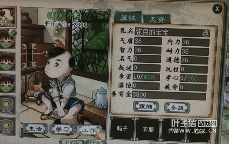 感谢大神“大话九封”的攻略分享,下图中的这个孩子是老版的,养育金就3800而已,新版孩子6岁的时候养育金2160所以养成方法和新版的一样: 6岁开始去做家务(给叛逆扣气质所以这个第一做)到疲劳满(疲劳满是300,300以上打工学习都不可以但是可以去皇宫),然后去皇宫到7岁。 7岁后去海边到疲劳30左右低于30高于30的再去一次,然后继续做家务到疲劳满,接着一次海边降低一次,继续家务这样循环到7岁11月如果疲劳满的去海边降低一次然后做家务到8岁即可,但是如果去一次做家务就疲劳满了就去一次皇宫这样保持疲劳满到8岁,如果是7岁11月疲劳没满就去做家务到疲劳满然后去皇宫到8岁即可。(这个种孩子养育金只有3800神结局遇到乞丐不给钱,不要道德的,遇到算命的也不给钱) 8岁了去野外到疲劳40左右同样的高于40再去一次,然后做家务把叛逆弄到1180左右越高越好如果不能去了,大概是8岁8个月的时候,你再去系统会提示你再继续做家务属性会爆满的,接着去学习音律加气质到疲劳满,疲劳满了就去野外降低一次,然后继续去学习音律。这样循环到8岁11月还3次就9岁了,一定得保持疲劳满的,如果这三次的操作疲劳满了,可以去皇宫到9岁,因为疲劳满了也可以去皇宫 9岁开始穿装备把道德弄到50,去一次太医院降低疲劳解除太医院煎药打工,解锁后装备记得下了。太医院煎药解锁了,就先去皇宫把养育金用完,然后太医院煎药,养育金够120就去皇宫,不够就继续太医院打工,疲劳满就去一次太医院降低,这样循环保持没钱疲劳满的到10岁。 10岁了去地府降低疲劳到40左右同样的高于40再去一次,地府降低疲劳会扣除名气但是会给玩性互补正常情况。然后去孤魂引路打工一次给120养育金刚刚好后皇宫和其他的学习,打工到疲劳满,接着去皇宫把名气弄到1120-1150之间,养育金不够就孤魂引路,疲劳满就去地府降低,11岁没开新场景所以11岁还是去10岁的场景打工和降低,名气够了之后,继续学习音律加气质音律累积30次开启舞蹈的条件,武术美术诗文也是累积学习30次开启对应的学习,一直学习。地府降低疲劳和孤魂引路都是一次次来,因为12岁要去黑市降低了,所以12岁之前你得保持疲劳是满的,黑市降低疲劳会扣除智力但是我们给的引导没有加智力的所以不怕被扣除,这也是为什么说引导到让你吃三字经的都是坑货,因为三字经加智力和道德,而新版孩子结局前不需要道德的,结局后你要追属性也是去赌场最快的,赌场扣除道德加玩性,正常靠赚钱追属性的三天加一点属性,而你去赌场加玩性评均每天加两点。 12岁开始去黑市降低疲劳到40左右,高于40再去一次,打工还是继续孤魂引路。别去黑市小贩,因为黑市小贩虽然给160养育金,但是一次扣除9点属性点,而你去孤魂引路赚钱不扣属性点的,孤魂引路一次,学习音律一次,这样保持到疲劳满,然后黑市降低一次打工一次学习一次保持没钱满疲劳到13岁,因为去卖萌一次900养育金旅游减少280疲劳。一次都需要800万大话币。音律就够30次了,会开启舞蹈,但是别学习舞蹈,因为舞蹈有加智力,而我们还得去黑市降低,所以30次音律了,就开始学习武术。12岁11月的时候记得满疲劳和没钱,疲劳满了可以去皇宫的,这也就是为什么让名气先到1120左右就可以了,就是为了13岁前更好的操作让没钱满疲劳到13岁的,皇宫的说了几次了,疲劳满也可以去的! 13岁到结局,开始疲劳满去旅游,没养育金就卖萌。到结局都是卖萌旅游了,音律武术美术智力也各学习30次。对应的开启舞蹈宗教骑术建筑。然后各学习13次就快结局了,剩下的操作次数,把耐力内力气质智力,学习对应的宗教建筑骑术舞蹈加到1180左右即可, 装备搭配买主道德的就可以了,武器75道德以上,衣服25道德左右,帽子15道德左右,鞋子8道德左右就可以了。 没重置过的孩子会遇到以下几种突发事件。遇到算命要40养育金点取消不要给,就是系统坑你的一种。要礼物必须给杜老板那里卖的15和20万的随意一种都可以。谈话点确定即可。回答问题必须答对都排行榜的用飞行旗取消然后查看下或者多开的用另外一个号查看都可以。要10万大话币必须给,换取50养育金。结局要追属性的直接去赌场把玩性加到1200然后用无字天书把玩性洗道德上即可,过程大概要600天,而你正常追属性得10年以上!(这个方法得2个孩子才可以用,因为去加玩性会导致评价变0了,洗了就正常了)不追属性的把技能修炼满了即可,孩子岁后就得去做心性任务,孝心亲密加起来低于400点的每周可以学习10次,也就是需要500的心性,400以上的每周250点即可学习5次,评价再高亲密孝心低也没用的! [编辑:落雪]