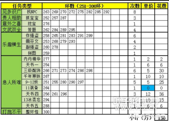 相信我们很多玩家都喜欢跑300环,因为最后一环的高几率使得我们对它简直又爱又恨. 但是你们有谁认真的统计过到底300环需要耗费多少大话币么?今天他来了:碧水潭主大神. 跑一次300到底需要消耗多少大话币,周末无聊就把300环功绩过了一个,过程中每一环都仔细记录了下,过程不多废话,直接上结论. 点卡和飞机油钱不算,超过30万物品(盘古/补天/11装)用灵气,所以统计表中单价统计为0(标记蓝色位置),总共花费707万,物价按照我们区物价,点卡5500左右。 鉴于NPC索要物品种类几率问题和收购物品价格问题,花费应该普遍维持在700万±10%,所以,如果你和我一样,最后得到是一个六魂的话,你可就真的赔双倍了.