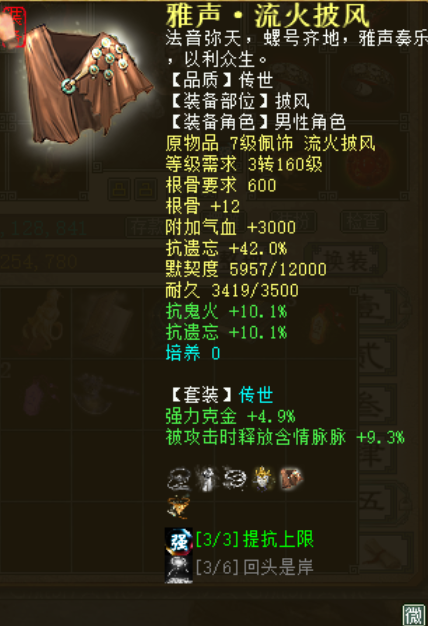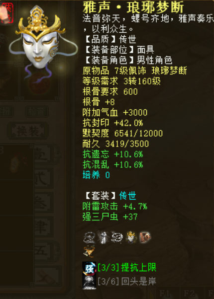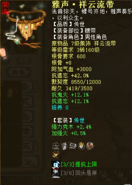 今天给大家分享一下我男鬼杀穷奇的装备属性是怎么配的,有兴趣的可以跟着打造! 下面是杀穷奇时候的男鬼抗,领了月卡抗8,吃了抗8符文,领了穷奇的加成抗,好像是10点,男鬼是三世女魔修正,由于星卡上的是青龙,并没有给男鬼增加任何好的属性,只是让男人蹭个青龙而已 衣服是刚玩这个男鬼买的衣服,由于克火有21,480根骨能用所以比较贵,跟着买个回血程度24,抗混比这个高的,50块钱左右的就行了,这个衣服抗真的不高,才抗28,青龙卡不建议买,没给我男鬼加任何属性 这帽子当时应该是90块钱买的,带低级召唤兽支援,这样男鬼不用叫召唤兽,可以持续出手,抗也不是很高,就抗30.6的冰而已,不要召唤兽支援就买普通的40块左右 抗比较高的项链,大概300块,可以买普通抗冰40 三尸32以上的就行,大概200块左右,三尸狂暴绝对不能忽视,很有帮助,能高尽量高吧,但是不用挑太贵 抗好的200,抗普通的11级三尸32以上的也就100左右,这个钱不能省: 单回5级,1600元左右,贪它的虫子6000回血程度50,16级5500虫子狂暴30也行,500左右 下面是配饰抗,套装推荐打雅声+破军,护身符四抗上限虫子狂暴,以前我抗睡140没用放弃了: [编辑:期许]