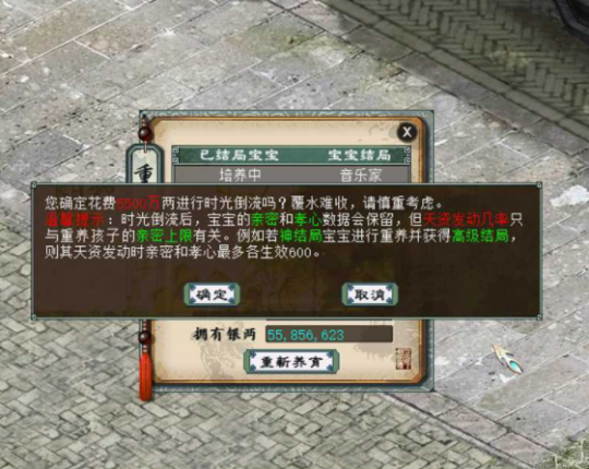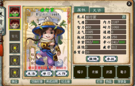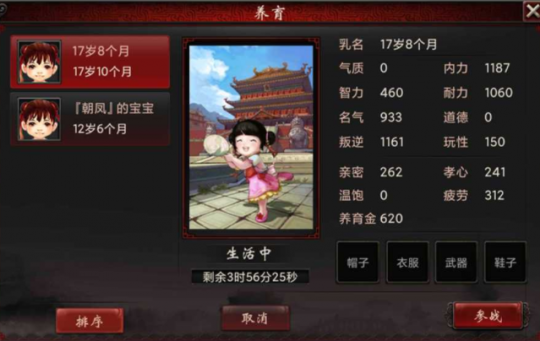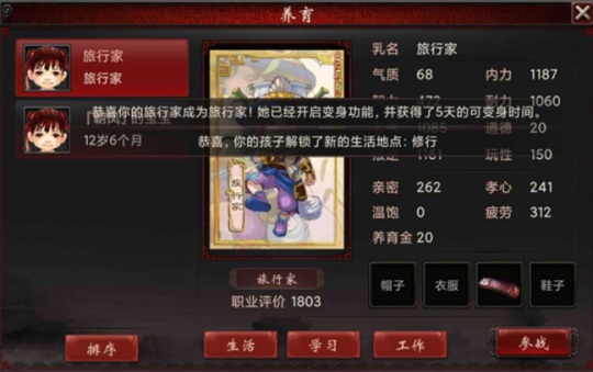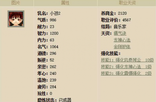 由于孩子买来是音乐家,重养花了一个多月(定闹钟用口袋版养,上线操作10秒下线不费点),用网页算穿装备评价在4818,洗完玩性还会涨一些。 每岁的内容为循环前面6-13每岁的第11个月第3次操作后尽量保持疲劳满进入下1岁(开新生活内容减疲劳多,如第2次操作就满了够钱就去次皇宫)。 |