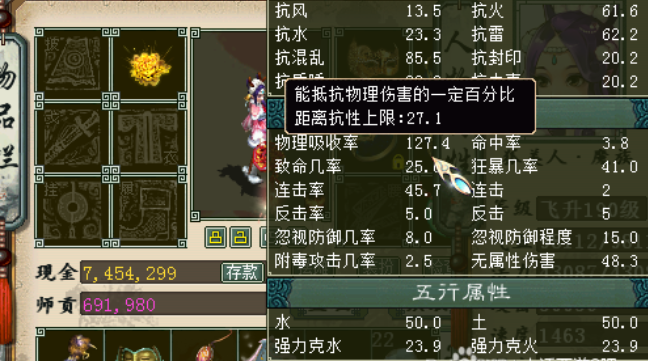 妃子4法减抗,结果砍了975 妃子技能消失后,使用43级锤子,结果砍了1401, 这说明锤子的效果有降低对方物理吸收作用,且效果比妃子强。 2、抗物理127;使用43级大势锤后,伤害为111(随着物理抗性增加,减少伤害) |