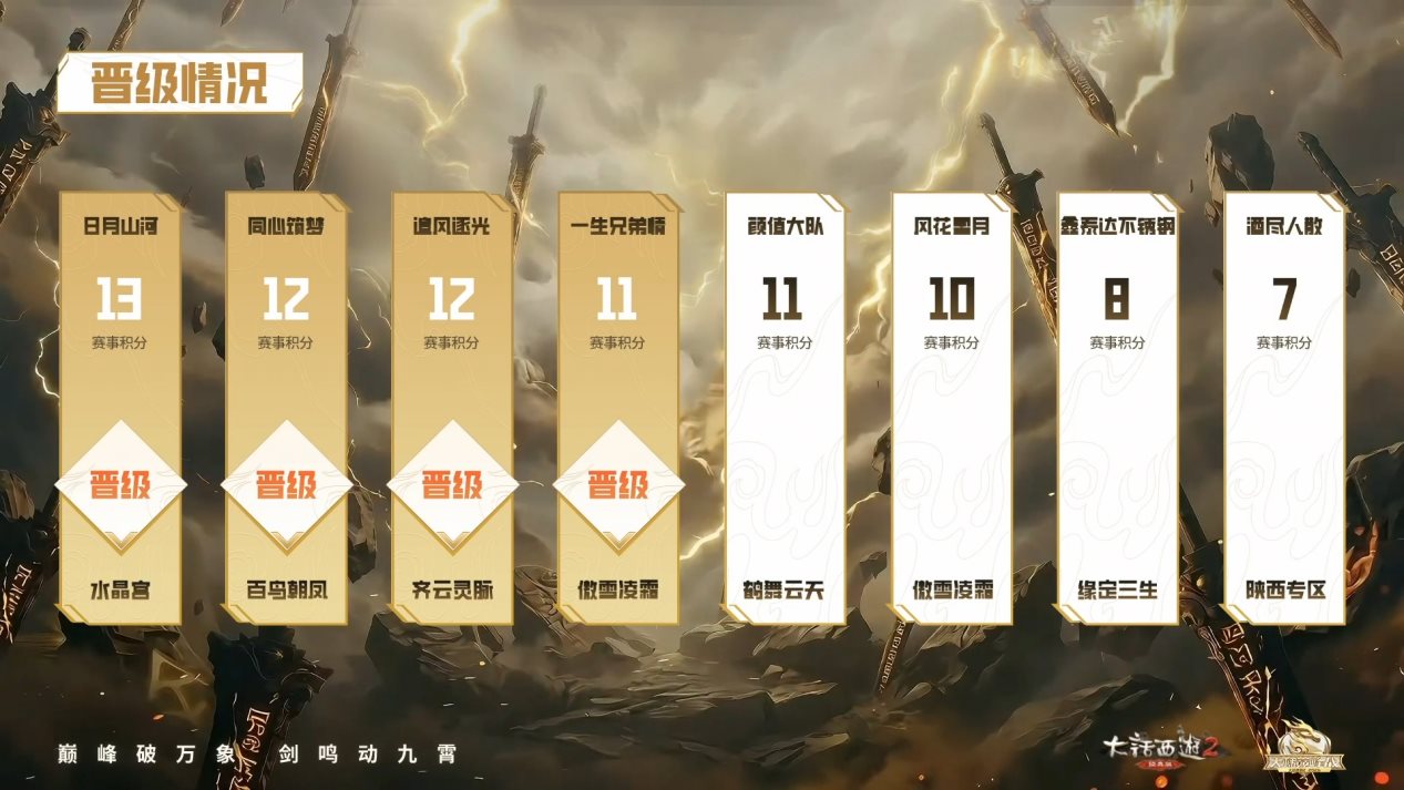 巅峰破万象,剑鸣动九霄!2026天梯巅峰战年度总决赛16强抢位赛圆满结束,A、B小组前四名战队喜获晋级,他们也将在4月16日再登擂台,与1~8号种子战队角逐8强抢位赛! 众志成城服务器“山西庞泉”战队积13分列小组第一、凌烟阁服务器“昔日き同盟”战队积12分列小组第二、天若有情服务器“无所畏惧”战队积12分列小组第三、红颜知己服务器“乘风破浪”战队积11分列小组第四,以上四支队伍也顺利晋级到8强抢位赛当中,恭喜他们! 水晶宫服务器“日月山河”战队积13分列小组第一、百鸟朝凤服务器“同心筑梦”战队积12分列小组第二、齐云灵脉服务器“追风逐光”战队积12分列小组第三、傲雪凌霜服务器“一生兄弟情”战队积11分列小组第四,以上四支战队也顺利晋级到下一轮! 天梯烽火已燃,“巅峰竞猜”玩法第二轮也已全面开启,少侠别忘了打开游戏左上角天梯巅峰战,选中巅峰竞猜页面参与其中,竞猜成功即可获得积分奖励,积分除了可兑换各类游戏道具外,还有机会获得ROG枪神8笔记本电脑、2025鎏金宝鉴典藏版等实物大奖! "巅峰创作奖励"活动也火热进行中!围绕赛程解读、赛事战报、高光集锦、战术分析等主题进行创作,发布时带上话题#2026天梯巅峰战及#大话西游2经典版,按常规方式投稿即可参与,有机会瓜分超4万元大奖,以及最高1888元现金红包、精美周边等惊喜奖励!其中表现出色者,更可赢得包机酒线下观赛资格,直通青岛线下总决赛现场,亲历巅峰对决! [编辑:莫听雨]