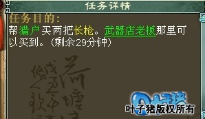 采药人完后他会提示你下个接着找谁。。基本上就是跑跑腿不需要杀怪。偶就不多说了 不过有个跑腿的小细节需注意下那就是猎户的他的任务是叫你买2把长枪。 测试的时候没注意,还以为是买一把,害我说怎么不能完成任务!