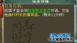 本周新科举在游戏试玩测试了。基本的流程和以前的老科举任务没什么区别。 首先到长安国子监领取任务:#p#副标题#e# 然后根据任务提示去完成、他会叫你去找渔村的村长拿推荐信#p#副标题#e# 领取任务后他催你去找村长#p#副标题#e# 打开任务提示可