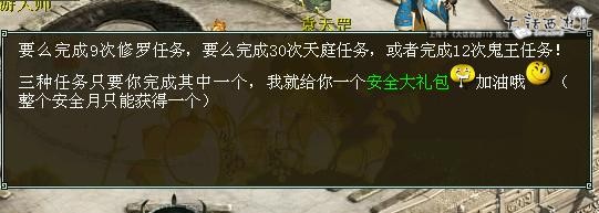 只要完成9次修罗任务、或者30次天庭、或者12次鬼王,就可以领取到安全大礼包。 礼包里是什么有没有很期待呢? |