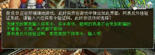 第三环:胡巧儿 一打听,原来胡巧儿在修的时候弹出界面要输入将军令,和真的验证界面一模一样,输入后被人顶号。 胡巧儿不相信你可以通过假将军令的验证,教你去找胡一刀接受测试。 也是有选择,选对可以直接获得奖励,错误了需要杀。 |