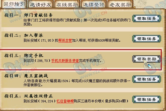 有的同学说,自己收到短信邀请,但是登录后没有输入ID验证的地方,可以用以下的方式: 1、在任务物品栏的“归来老友册”中领取“绑定关联手机”的任务 2、找洛阳桥上的收集关联服务使者验证手机。如果未绑定需要先绑定。如果已经绑定的,选择验证关联手机就行了。 3、验证成功后,邀请您的玩家就会收到邀请成功的提示了 <<<点击进入大话西游2论坛讨论>>>