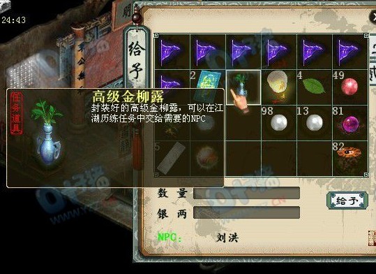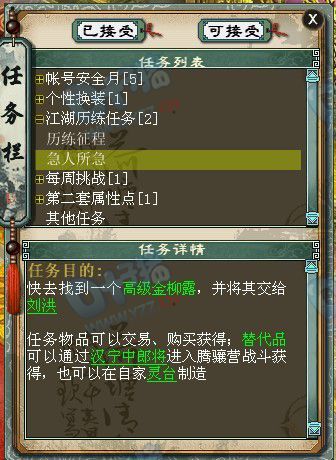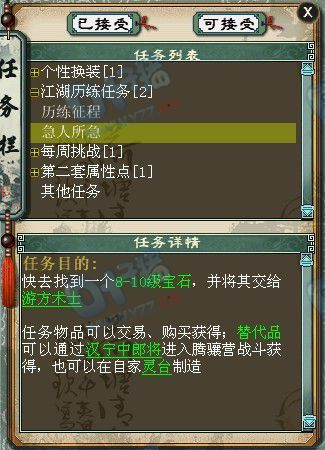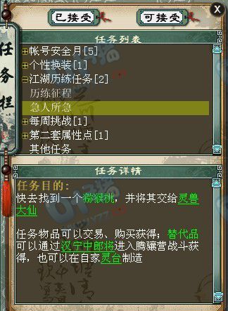 2-4-1:急人所急。游方术士需要一个8-10级的宝石,跑个300环,垃圾宝石也派上用场了! 2-5-1:急人所急-刘洪。谁说高级露露是给宝宝吃的,刘洪竟然也钟情这玩意,马上送去! 2-6-1:急人所急。灵兽大仙懂得养身之道,突然想吃猕猴桃了,新鲜的猕猴桃送上。 |