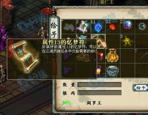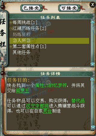 2-7-1:急人所急。阎罗王的需求不简单,一个属性13的忆梦符,童鞋记得这些+13的炼妖别乱扔。 4-1-1:固定BOSS。终于100环了,终于出现传说中的BOSS了!土匪头目位于修罗古城(260,223),建议组队去杀,难度系数不算大,经验奖励翻了一倍。 |