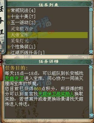 今年的五一任务没有以前那些任务那么繁杂,而且时间方面也相对来说比较合理!目前整个5.1任务有三个分支,分别是:灵宠值万金、天帝宝库、采集灯元。活动时间:2013年4月29日至2013年5月3日。