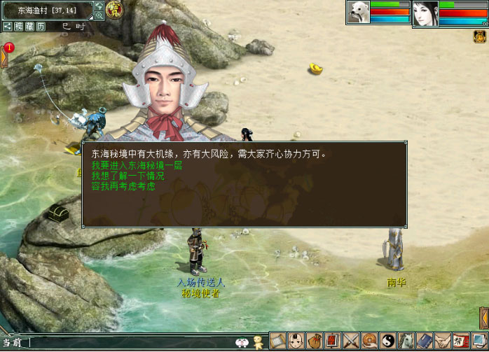 二、东海秘境(BOSS,组队) (一)温馨提示 若中途离开秘境,则重回秘境时需要从进度最低的成员可挑战的层数开始。 (二)参与条件 组队,角色等级≥30级,时间宠≥10级 (三)玩法介绍 1、大家可组队前往东海渔村(33,6)处找秘境使者进入东海秘境。 2、东海秘境共用九层,需从一层开始,闯过各层的阵法后才能进入下一层。 3、随着层数增加,难度也会逐步增加。 4、每天各层阵法只有挑战通过才有奖励。