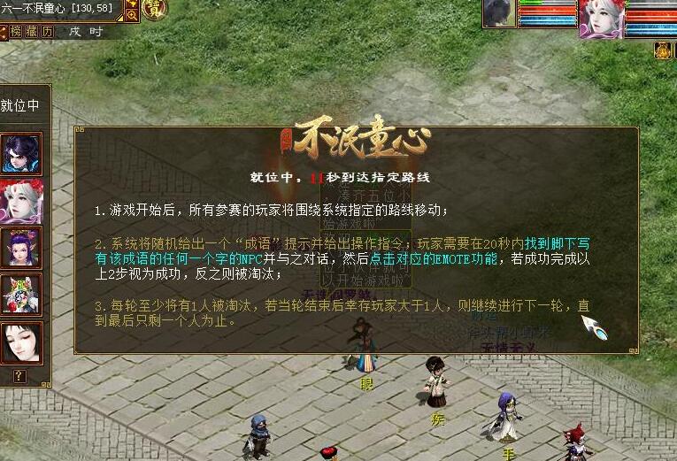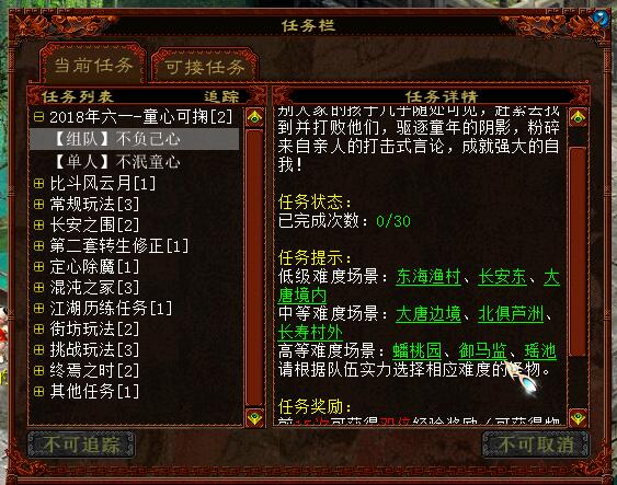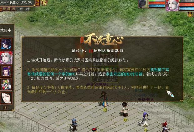 全世界最快乐的日子,六一儿童节来了!想想小时候的你,最期盼的就是这个节日吧,可以尽情的玩,尽情的吃……现在的你,是不是也想如同幼时一般肆无忌惮地玩乐一番?2018六一童心可掬任务主题十分好做易上手,下面焚迹给大家带来相关的组队以及单人玩法视频! 【组队】不负己心——组好队伍,去长安桥210.127找NPC 【时光老人】变身,去击败“别人家的孩子”。分三个难度的场景,可以根据自己实力选择相关的难度。(这个设计十分贴心可以让不同等级阶段的玩家挑战)怪物属性难度都不是很大。 如图: 【单人】不泯童心——单人任务,去长安桥190.120找NPC【爱玩的小孩】进入场景玩游戏(每晚19:00-23:00可以参加单人娱乐玩法不泯童心 )。考验的是成语填空以及自己的反映,根据当前提示找到相关成语填好空做出相关对应的动作即可。 注意,每次操作的时间只有25秒,正确答案永远比参与人数少1,所以每轮至少淘汰1人。所以大家动作一定要快,猜成语一定要准噢! 活动时间:2018年5月31日、2018年6月1日每晚19:00-23:00 活动对象:角色等级≥50级,时间宠≥10级 如图: 单人玩法的奖励兑换: 游戏结束后,大家将会根据各自的表现获得相应积分,积分可以用来兑换奖励,每轮可根据淘汰人数获得200-800积分,单人每天最高可兑换积分为4000分。 需要注意的是活动结束当天24:00前将会清空积分,清空时如玩家身上有积分,则将玩家未兑换积分按照一定比例兑换成经验,所以请一定要在当天23:59前兑换完毕哦! [编辑:韦小贝]