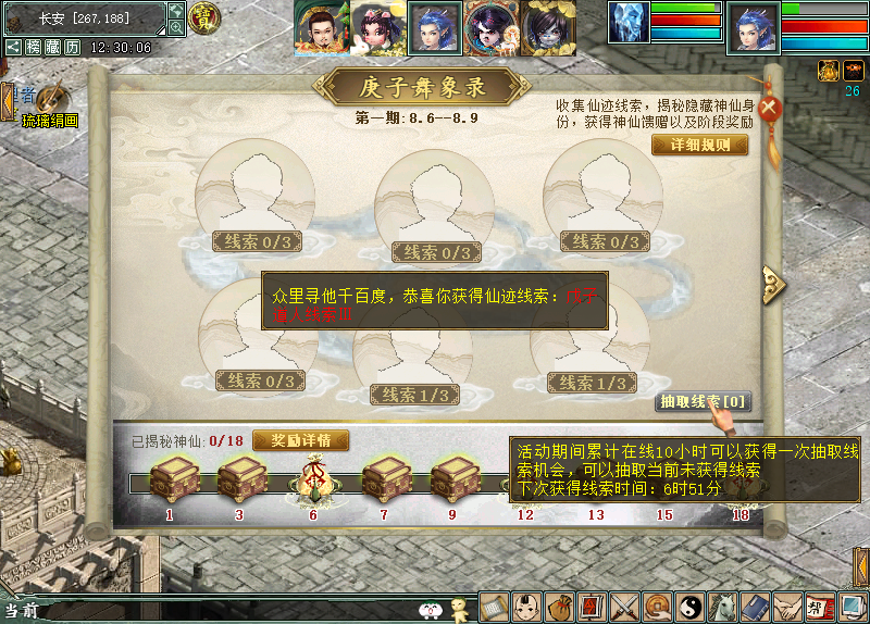 新大话西游2十八周年庆就要开始了! 周年庆活动风华礼序,群贤毕至究竟是什么样的呢?一起来和小编看看吧! 一、单人任务:庚子舞象录 1、活动时间 2020年8月6日10:00到8月9日23:59:55 2020年8月13日0:00到8月16日23:59:55 2020年8月20日0:00到8月23日23:59:55 2020年8月6日10:00到8月23日23:59:55,累计在线10小时即可抽取未拥有仙迹线索 2、参与条件 等级大于等于30级,时间宠大于等于10级 3、活动场景 不限制 4、活动背景 庚子荷月,大唐上下举国欢庆风华礼。三界中位列壬午到己亥十八位神仙也前来同贺,他们提前隐藏成路人百姓来考察风华礼的筹办事宜,同时将仙迹记录在庚子舞象录中。 活动期间通过完成周年庆活动、日常活动、累计在线等方式均有机会获得仙迹线索和风华印记,凑齐每位隐藏神仙对应的3条仙迹线索后即可进行揭秘,神仙身份被揭秘后开启神仙的馈赠,消耗风华印记可以进行兑换。 5、活动流程 活动期间完成周年庆活动、修罗任务、域外风情、宝象降魔、鬼王任务等有机会获得仙迹线索和风华印记,收集每个隐藏神仙对应的3条线索后即可进行身份揭秘。 活动分为三期,每期对应六位隐藏神仙。活动开放当周可通过相同途径获得前期缺失的仙迹线索,且获得概率会相对提高。 当神仙身份被揭秘后开启神仙的馈赠,使用已获得的风华印记即可进行兑换,每位神仙可兑换一次。 活动期间,累计揭秘1、3、6、7、9、12、13、15、18位神仙身份后可领取庚子舞象录中的阶段性奖励,其中领取揭秘6、12、18次奖励后,当周周日19:00整点在线即可自动参加抽取珍稀神兽,活动三周将依次抽取珍稀神兽白泽、画中仙以及年。 累计揭秘奖励可查看舞象录中【奖励详情】。 2020年8月6日10:00-2020年8月23日23:59,在游戏中累计在线10小时可以获得获得一次抽取目前未拥有线索的抽取机会。 6、活动奖励 1.收集隐藏神仙对应的3条线索后,进行身份揭秘时可获得物品奖励; 2.隐藏神仙身份被揭密后,消耗300风华印记可兑换馈赠礼物,每位神仙可兑换一次; 3.累计揭秘1、3、6、7、9、12、13、15、18位神仙身份后可领取庚子舞象录中的阶段性奖励; 4.领取累计揭秘6、12、18次隐藏神仙身份奖励后,当周周日19:00整点在线即可参与珍稀神兽抽奖。 5.累计揭秘全部18位神仙身份后,可以获得功绩《群贤毕至》奖励。 物品奖励包括