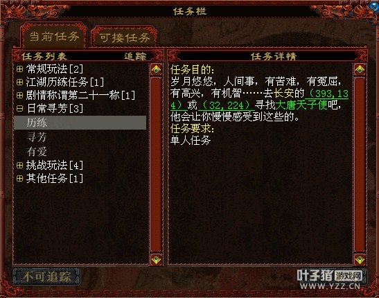 历练任务(单人) 单人任务很简单,不过相当耗时间,来回跑地图,也正因为如此,好多人都不喜欢去做,但经验还是不错的,5次单人任务随机,奖励每次58W经验左右。 |