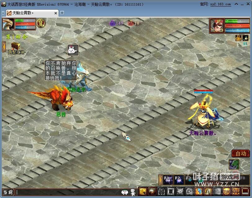 本周维护之后,召唤兽灵犀系统将在全服开放!以下是灵犀任务单人轻松简单通杀小攻略。 任务条件:人物飞升,任务栏自动获得“灵犀任务”,需单人完成(若任务无此任务,建议重新登录游戏,30分钟有效) 任务流程: 困兽犹斗:找恶兽(战斗)-恶兽-播放剧情-阿黄(战斗被收召唤兽)-阿黄(选择帮找主人或做它主人,开始以下分支任务) 帮找主人:找魏小宝-买主-阿黄(任务栏寻路)-孤魂(阿黄的主人)-阿黄 做它主人:收服阿黄(战斗)-选择放生/不放弃-阿黄(战斗)-阿黄 任务完成:完成后,已点化的召唤兽栏获得“灵犀”键,开启灵犀技能 玩家介绍: 1、首个单人任务就可以单人简单击杀怪即可。 听完大黄的故事进战斗.... 2、人物防御,让对面的收走BB,然后它们就会跑了。不用组队杀,建议关闭召唤兽支援,如果你觉得不麻烦的话。 3、选择做它的主人的话,会进战斗,人物防御到对面2个互杀死就好。 4、选帮它找主人就是做找几个NPC交谈完事,很简单,看你自己的选择。 [编辑:韦小贝]