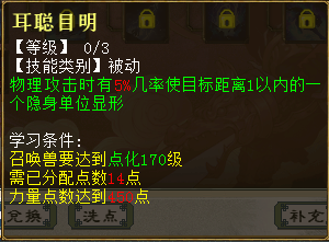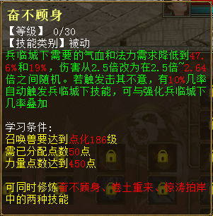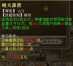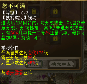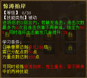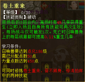 1、奋不顾身 出现在第8秒 兵临城下需要气血和法力需求降到47.6%和19%,伤害从2.5倍改为在2.5倍~2.64倍之间随机。若触发击其不意,有10%几率自动触发兵临城下技能,可与强化兵临城下几率叠加。共30级,最高分别到10%、5%、5倍、60%。 2、耳聪目明 出现在第10秒 物理攻击时有5%几率使目标距离1以内的一个隐身单位显形。每级加2%几率,共3级。 3、怒不可遏 出现在20秒 进场后的3回合内,每分裂攻击1次(包含战意分裂、分花拂柳、高级/普通分裂攻击),有30%几率提升自身3%狂暴几率,最多可叠加3层,持续1回合。每级加10%几率、1%狂暴,共3级。 4、惊涛拍岸 出现在33秒 进场后的3回合内,若触发连击,连击次数最多为6次且连击伤害不再衰减,稳定为50%。共30级,最高分别到8次、80%。 5、战意、强力、护盾状态 为其他技能的附加状态,出现在44秒 6、晴天霹雳 出现在55秒 进场后的3回合内,物理攻击时若目标当前血量大于30万,有45%几率提升自身4%致命几率,持续1回合。每级加15%几率、1%连击,共3级。 7、卷土重来 出现在1分05秒 进场后的3回合内,离场时有4%几率获得重生(立即入场且自身所有技能可再次生效),每场战斗仅可触发1次。死亡时召唤兽身上的每层战意都可提高0.11%重生几率。共30级,最高分别到26%、1.1%几率。 其他常见问题 1、灵犀丹怎么获得 ==>目前在天梯积分兑换可以获得。其他途径如果有投放会再进行公布。 2、召唤兽交易之后灵犀点会不会清空?