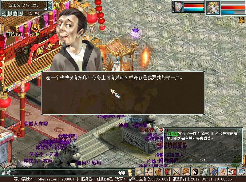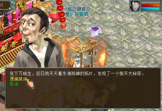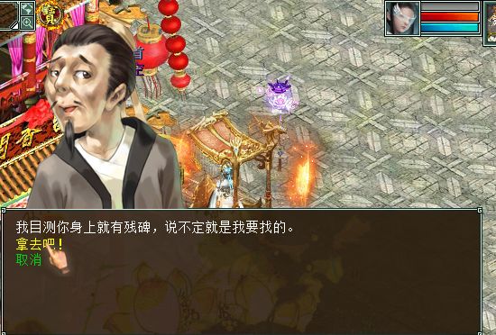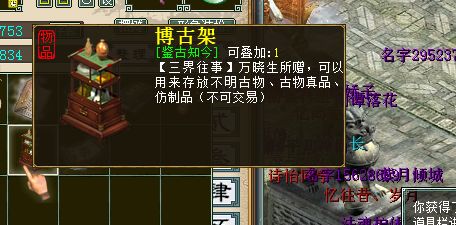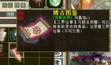 前日,“三界往事”活动开启,终于揭开了之前捡到的“残碑”的神秘面纱——原来它是用来开启“三界往事”任务的剧情道具。 身上带着残碑,和万晓生(洛阳139,120)一番对话后,可直接获得博古架和博古图鉴。 |