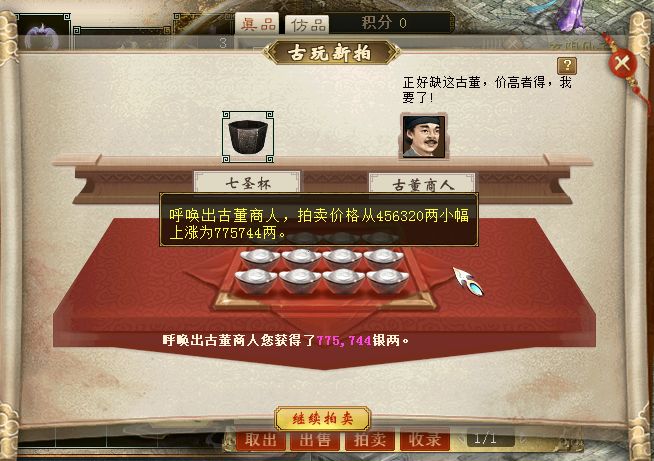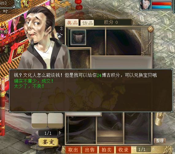 挖到的不明古物可以找万晓生鉴定,鉴定后的古物将被放在博古架中,并可以收录于博古图鉴。 已收录的古物,可以出售给万晓生换积分,积分换奖励; 也可以拍卖,换成大话币; 还可以用挖到的玉石碎块等东西制作仿品,仿品也能出售、拍卖。