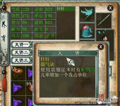 2009年2月16日出生的孩子,到现在,前几天刚刚成年,由于是第一次养孩子,这个孩子算是个半试验品,不过效果挺好。离我心中的完美还稍差一点,不过也算很好了。 另外,我把各个职业的养孩子图片和最优比例图片都发出来,仅供大家参考一套2级装备,算了下上3级也