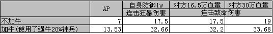 主题一: 狂暴与致命 先说结论:7万攻击, 75的连击致命与75连击狂暴 在不加牛的情况下:17万血量为临界点 高于17万用致命好些 在 加牛的情况下:狂暴和致命效果相当,选择哪个都无所谓 狂暴:攻击*1.5 + 自身防御 致命:攻击*1.5 + 对方血量/10 连击伤害输出计算公式:(连击次数5) ( POWER(0.5,0) + POWER(0.5,1) + POWER(0.5,2) + POWER(0.5,3) + POWER(0.5,4) )*(:连击率/100) + (1 - :连击率/100) POWER(0.5,n)为0.5的n次方, 连击的伤害递减为50% 如连击率75%则 0.75*连击递减伤害累计+ 0.25即为连击伤害加成1.7 连击致命伤害计算公式: ( POWER(0.5,0) * ((:攻击 *1.5 + :对方血量 * 0.1)*:致命/100 + :攻击*(1 - :致命/100)) + POWER(0.5,1) * ((:攻击 *1.5 + :对方血量 * 0.1)*:致命/100 + :攻击*(1 - :致命/100)) + POWER(0.5,2) * ((:攻击 *1.5 + :对方血量 * 0.1)*:致命/100 + :攻击*(1 - :致命/100)) + POWER(0.5,3) * ((:攻击 *1.5 + :对方血量 * 0.1)*:致命/100 + :攻击*(1 - :致命/100)) + POWER(0.5,4) * ((:攻击 *1.5 + :对方血量 * 0.1)*:致命/100 + :攻击*(1 - :致命/100)) )*(:连击率/100) + (1 - :连击率/100)*:攻击 连击狂暴伤害计算: ( POWER(0.5,0) * ((:攻击 *1.5 + :自身防御)*(1 - power((1 - :狂暴/100),1)) + :攻击*power((1 - :狂暴/100),1)) + POWER(0.5,1) * ((:攻击 *1.5 + :自身防御)*(1 - power((1 - :狂暴/100),2)) + :攻击*power((1 - :狂暴/100),2)) + POWER(0.5,2) * ((:攻击 *1.5 + :自身防御)*(1 - power((1 - :狂暴/100),3)) + :攻击*power((1 - :狂暴/100),3)) + POWER(0.5,3) * ((:攻击 *1.5 + :自身防御)*(1 - power((1 - :狂暴/100),4)) + :攻击*power((1 - :狂暴/100),4)) + POWER(0.5,4) * ((:攻击 *1.5 + :自身防御)*(1 - power((1 - :狂暴/100),5)) + :攻击*power((1 - :狂暴/100),5)) )*:连击/100 + (1 - :连击/100)*:攻击 由于狂暴出一次,就次次出, 则狂暴的概率为 第n次连击时: 狂暴的概率为: 1 - (1 - 狂暴/100)的n次方 非狂暴的概率为(1 - 狂暴/100)的n次方 |