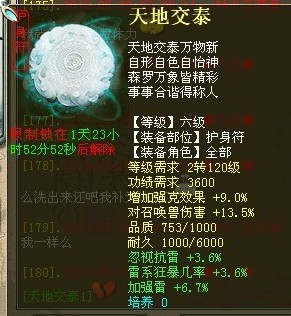 第二,绿字的洗炼属性(说到这里压根痒痒,恨不得把开发组跟网易的死成碎片我都洗了7Y左右了有木有,垃圾特技也没出几个有木有,体力都没了有木有) 这里贴几张绿字的图还有官方给出的特技属性的描述作为引子: 由于护身符绿字很多炼化出来的属性可以说是完全鸡肋的属性(例如每回合回MP和HP到6J就是满品质的护身符也就回100多你说有用不),在这里也就不做过多的赘述,仅仅阐述一下一些当前来说包括将来也算是极品的属性。 绿字里所涵盖的包括:人族强法和忽视人法,仙族强法和忽视仙法以及法术狂暴,鬼族强法和法术狂暴还有忽视遗忘和回血程度,魔族忽视震慑强震慑。物理属性有命中,强克五行属性全部都涵盖在内。(垃圾的属性就不说了,如果你非要玩个性弄附法,里边也有附法攻击,不过没有附B和附混) 官网所给出的绿字属性大家很多估计也都看过了,链接:护身符绿字说明 (洗绿字洗了大概有7Y左右,没有太过满意的属性,也就大力的护身符下边绿字洗出来三项强克,也还算满意了,毕竟修罗的时候还有杀塔部分怪还是有五行属性的) 更多游戏资讯请访问叶子猪游戏资讯中心:http://news.yzz.cn/ |