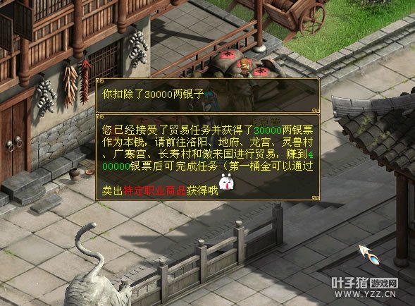 领任务扣3万两作为银票,刚开始做时可以花点钱去王元宝那里买些低价的物品卖给商人换取些成本。没有太多钱的话,做任务还是很难受的。
