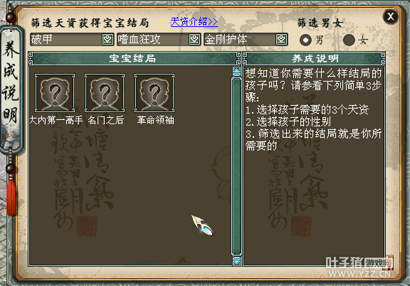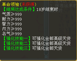 2、根据孩子性别、孩子最终所使用的天资技能,筛选出合适的结局。如大力孩子所适用的结局。 3、筛选结局后,查看结局所需条件。如神结局:革命领袖 4、根据结局所需条件进行培养孩子。 “学习”可以获得气质、内力、耐力、智力,每进行一次学习需消耗120养育金并增加一定疲劳; |