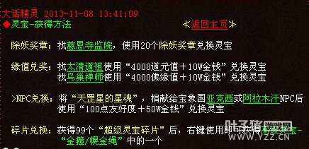 >>推荐阅读:收号的土豪看过来:神兽号3五常6人形1头年 灵宝出来后,一直没去研究,一分钟都没去看。 昨天至今天,这是我对灵宝的笼统认识,也希望能给一些茫然不知所措的兄弟一些微不足道的帮助。 1、怎样获得灵宝? 杀塔:两天20个奖章随机换一个。 星魂兑换:杀天罡星给的星魂可以兑换成有好度,使用有好度+50W金钱可以兑换灵宝; 释道修元:4000点道元随机换一个灵宝;(一小时挂40点道元) 碎片兑换:获得99个“超级灵宝碎片”后,右键试用即可获得高级灵宝“金箍/晃金绳”中的一个。 更多游戏资讯请访问叶子猪游戏资讯中心:http://news.yzz.cn/ |