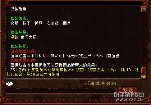 07-蓝枫 套装名称:蓝枫 装备角色:男性 套装组成:衣服 帽子 披风 右戒指 面具 掉落场景:卓越 技能名称:血海迷蛊(5件) 蓝枫残雪(5件) 技能介绍: 血海迷蛊-释放后,被命中目标无法被三尸虫回复血量(无法向到底单位使用,10回合后可以使用,持续1回合,冷却时间10回合,目标10)。 蓝枫残雪-命中后目标无法获得药品效果(无法向到底单位使用,10回合后可以使用,持续1回合,冷却时间10回合,目标10)。 可搭套装: 蓝枫+须弥(血海迷蛊+蓝枫残雪+见龙在田)-推荐度:★★★★ 蓝枫+禅林(血海迷蛊+蓝枫残雪+回法)-推荐度:★★☆ 套装点评: 血海迷蛊和蓝枫残雪都是颇有价值的套装技能。 血海震慑到的是中敏残梦队伍,这种队伍普遍队形为超敏冰+双中敏火力,此队形依赖极限-敏男鬼回血,保证第二回合的持续出手。试想血海之后,对方的双火力反震倒地,敏女魔和敏冰人被己方的-敏火力撂倒,这一切的一切都没有被回血起来,那么次回合将异常艰难。而这一切的一切又建立在几率套几率之上。怕只怕想法很美好,几率很糟糕。 蓝枫的主要震慑于本回合对方的出手,譬如男鬼没有被拉上蓝,敏人没有被女魔拉起召不出BB,残梦没有得到男鬼的回血,等等。这一环扣一环的节奏也许就会被某一个中招的点被打乱。 遗憾在于该套装搭配性较差。 推荐种族:敏冰人,敏忘鬼,混人 获得难度:★★★☆ 总推荐度:★★★☆ 更多游戏资讯请访问叶子猪游戏资讯中心:http://news.yzz.cn/ |