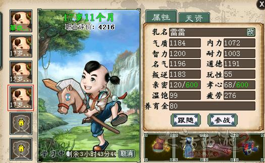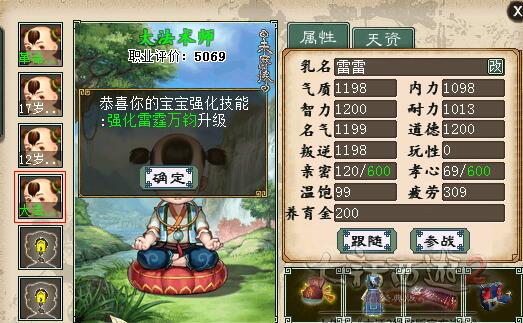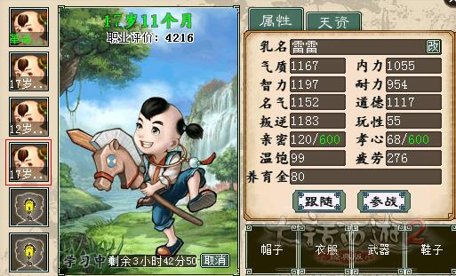 为了大家少走弯路,养个合适的孩子,这位玩家把自己真在养的大法术师发出来互相学习下! 养仙族高级结局 首先智力最高,要学习武术30次,其次 智力,气质,名气,都要大于999 ,智力必须最高这点最重要. 如果想要评价最大化就把叛逆,道德,也尽量堆高。(内力,耐力)其中一项小于999,随便那个都行 我是把耐力卡在999以下 这样可以高级结局评价最大化。当然这样也比较花钱。 如果不想花太多钱养高级结局 就把 智力,气质,名气,学到999以上 智力999以上保证最高 在把其它几个属性也在追追就行了. 结局的时候最好别穿装备,结局后再穿。 高级结局在于强化天资容易,配上装备也有900多道德了,12岁还能追次,13岁学习主属性,那么,这个大咒术师就此出世! [编辑:韦小贝]