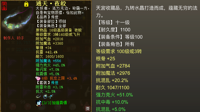 项链,选择常规高克项链,有蓝字忽视抗震慑更好,不过这种还是比较贵的,抗性方面看装备总体的搭配,日常的话可以不考虑抗冰了。 星卡,有条件上双忽视震慑的,要不就是一般克+忽视,或者强法加忽视那种,毕竟双忽视星卡稀少而且价格不菲,几千大洋够吃好久的忽视抽符文了。还是这种的实用一点。 护身,这个选择比较多。个人比较喜欢四抗上限+抗震慑魔法的底子,选择四抗是为了提升抗性上限,省了提抗套装打其他套装,毕竟魔族的110上限还是不够用的,尽量是把抗混上限和抗遗忘上限的宝石也打上,日常变了抗性卡,达到150-160的抗不是问题。抗震慑魔法这种的属性日常挑战续航比较舒服,如果能搭配上带抗震慑魔法的衣服和帽子的话,就算被抽两下也是能放出法术的。下面绿字看能力,忽视震慑必选。 套装,克火就容止惊鸿搭配通天,通天传世可以增加4点加强震慑,其他的可以看看下雪,明心之类的套装,所有的目的只为高效率。 |