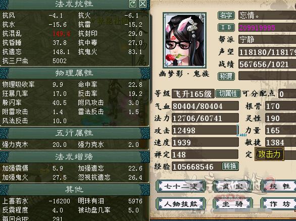 一直以来,女鬼这个角色一直不被待见 ,甚至觉得开发组都放弃了这个种族... 一般玩的人都是靠着信仰在玩 ,但是玩法却很单一,流行的有鬼火秒,高敏攻坚,遗忘很少有人玩,但是纯在即合理,那我们为什么不统一起来呢? 今天我就来分享一下我女鬼的玩法! 第一 纯敏法门女鬼,这个很多人已经玩的炉火纯青,我朋友高敏攻坚鬼高达2680的敏,由于他不在线无法提供图片,但是高敏法门女鬼基本上完法门除了法宝G和拉人之外没什么用了... 对了 ,刚才说的遗忘,为什么我们不能用呢? 这里我们需要一些装备,这个是我在阁子找了很久的,把之前的敏血发光遗忘武器卖了: 然后就是其他硬件 链子护身星卡: 护身品质越高越好,黄字可以无视,敏队纯敏控制无须其他抵御强克什么的,星卡是12级双忽视96资质的,有条件的14级双忽视带宫位更好。 女鬼还有一个专属套装 忘情 没错,传世+20%遗忘成功率,由于我配置一般 变果子或者范式强法卡能到2300+的敏,打架基本出手的话,魔炮法术基本不能用,男人果子减也能忘。 目前这个属性是站街低配属性,配饰和衣服帽子还有提升敏的空间,最终2500敏可以到!接着来看!