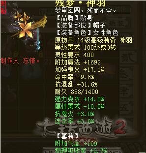 一直以来,女鬼这个角色一直不被待见 ,甚至觉得开发组都放弃了这个种族... 一般玩的人都是靠着信仰在玩 ,但是玩法却很单一,流行的有鬼火秒,高敏攻坚,遗忘很少有人玩,但是纯在即合理,那我们为什么不统一起来呢? 今天我就来分享一下我女鬼的玩法! 第一 纯敏法门女鬼,这个很多人已经玩的炉火纯青,我朋友高敏攻坚鬼高达2680的敏,由于他不在线无法提供图片,但是高敏法门女鬼基本上完法门除了法宝G和拉人之外没什么用了... 对了 ,刚才说的遗忘,为什么我们不能用呢? 这里我们需要一些装备,这个是我在阁子找了很久的,把之前的敏血发光遗忘武器卖了: 然后就是其他硬件 链子护身星卡: 护身品质越高越好,黄字可以无视,敏队纯敏控制无须其他抵御强克什么的,星卡是12级双忽视96资质的,有条件的14级双忽视带宫位更好。 女鬼还有一个专属套装 忘情 没错,传世+20%遗忘成功率,由于我配置一般 变果子或者范式强法卡能到2300+的敏,打架基本出手的话,魔炮法术基本不能用,男人果子减也能忘。 目前这个属性是站街低配属性,配饰和衣服帽子还有提升敏的空间,最终2500敏可以到!接着来看! 平时日常可以弄个敏装备打反隐,配合克火队5倍什么的反隐,足够,也可以纯敏丢法门 ,只需要吃个回法,省钱,1小时45次基本没问题。 当然,光靠一套遗忘走江湖也不不切实际的,那么咋办?来了,这个方案谨献给四上的区——你猜对了 ,灵性装备! 择灵性要求的装备是因为它只需要400灵,比根骨的少100,所以戒指和其他的配饰,可以达到这个要求,从而免去三清丹的消耗,鬼火一般配置都是补刀用。 武器可以买个4级神兵足以,如果没有灵性装备,敏要求的装备强14左右,也不会影响太大。 神兵队建议星卡用双无属性,存在即合理,用心玩好那个角色都有他的用处! 就分享到这里了,祝你们幸福~ <<<点击进入大话西游2论坛讨论>>> [编辑:韦小贝]