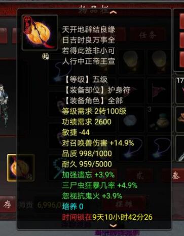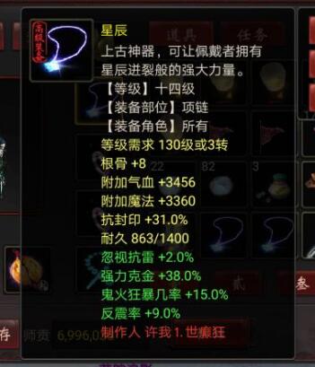 要什么神兵仙器,地魁星卡,极品装备,七级护身符,套装?法门罩子,天赋30,武器2000万收的,项链2000内,负敏鞋子20元,换成克11的可以再多5点克金,衣服帽子很一般吧,护身40秒的,配饰六级无默契100一件掏的,星卡没有买到呢,自己算算200用不完吧,由于时间仓促,随便混了个队,吃个克金符文,做了两次修就下了,1点半上班,后续会慢慢完善,修罗狂暴20多万: [编辑:韦小贝]