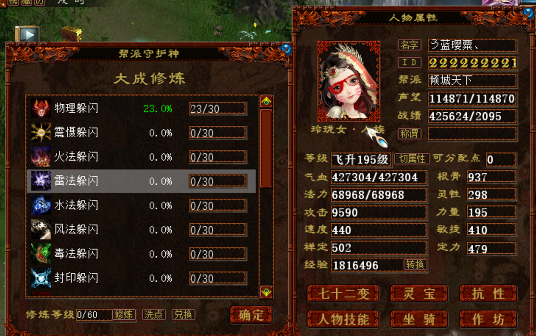 本文由绝命毒师提供给叶子猪 现在敏队龙族开始崭露头角,本文谨对以下配置要求的玩家为主: 1,五阶仙器衣帽。2,五阶仙器帽子、5-6级神兵。3,6级神兵帽子、五阶仙器衣服。 以上三种三选一,鞋子以步定为主。细节做足,可以达到效果就是,冰、混、遗忘、**雷100(风火雷100)---6抗。 1、修正选三世男龙族。躲闪36.9%、生命加成36.9%、伤害减免6.8% 2、定力以500点为基础,等级200的话选择600点,500点定力减免29%,600点定力减免34% 3、大成修炼30点选择30%物理躲闪 4、孩子技能选择金刚护体,并且选择“”金身不坏“”特技,很高的几率触发抵挡第三次伤害。 5、守中法门,伤害减免25.1%,抗仙法鬼火物理41.9% 综合以上搭配思路,减免可以达到6.8%+34%+25.1%=65.9%伤害减免(全类型) 大成36%+修正36.9%=66.9%躲闪。 躲不过去,就靠孩子金刚+金身不坏,前两者没被几率的话,就靠自身伤害减免硬抗,加上自身高血量,吃敏队两火力而不倒。 项链选择上可以选择高克的同时,带一些躲闪也是极好的。 下面这几张图就是今天小小的一个测试,希望客官喜欢! |