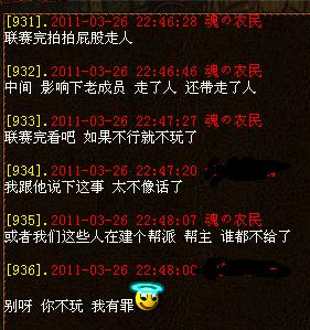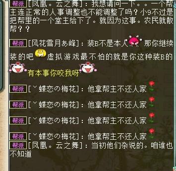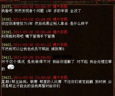 我回来后刚好是星期5 能帮战,第一场完了我一个老成员离帮了,我问他原因他说正在挑战 职务被换成香主,所以离帮了