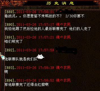 星期6帮战有人跟隐士9度说让他帮忙找个队伍,他就骂人家 具体我不记得是怎么骂的了,意思大概是不让帮里的人找他 要队伍了 老子不不管那, 这样搞,我们帮的人怎么想,隐士9度是第二大帮红茶坊的人因为红茶没他的名额 他跑我们这里了 当时我正在工作不知道他来 更不知道他多会当了帮主的