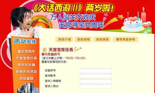 2004年周年庆(2周年) ——万人闯关齐欢庆,天宫寻宝共周年 活动时间:2004年7月1日-7月31日 奖励:龙之骨、小筋骨提气丸、七十二变套卡、人身果、蟠桃等 流程:到渔村找到天赎星君对话进入宝库(第一次对话时要求玩家找到玉帝)宝库共4层,每一层都有一名誓死保卫财宝的守卫及众多守财奴,地上散落众多宝箱。玩家点击宝箱后战胜贪婪鬼就可以得到丰厚奖励