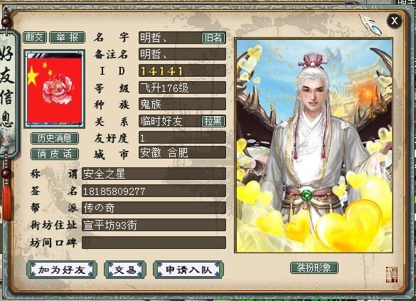 采访语录: 浅秋儿:你好,我是记者浅秋儿,很高兴认识你 明哲、:你好 浅秋儿:我记得你以前是普陀的,开移民后,也有在再爱一次见过你。兜兜转转了一圈,为什么选择在似水流年服务器了呢 明哲、:我本来就是似水出来的,后来才去的普陀,现在的队都是以前似水的老朋友 浅秋儿:这样吗,我以前也有在似水呆过一段时间。也是我很喜欢的一个服务器,觉得这个区的玩家都很热情 明哲、:是啊`原来似水挺火的一个区,现在鬼的不能在鬼了 浅秋儿:4年服务器也比较多,都分散在比较新或者热门一些的服务器了吧。不过有很多好朋友都是以前似水认识的哦。相信大家也很喜欢这个服务器的。你们队伍代表似水打得这几届比武打得很不错哦 明哲、:蒽 刚组没多久` 配合方面肯定还有点差距。革命尚未成功,仍需继续努力啊 浅秋儿:你们队伍的队员,在4年以下服务器都算得上数一数二的了。据说你们队伍的御弟哥哥,一个灵宝金箍就价值数十万呢 明哲、:哈哈,他是神豪,不想当将军的兵不是好兵,不想战4年的队不是好队,所以我们的目标不光是4年以下。 浅秋儿:低调的豪。一般人还真不知道呢,有机会在跟大家分享。最近几场比武都打的很不错,你们有什么目标呢 明哲、:现在还是有许多不足的地方。还需要大家继续努力,方方面面跟4年的肯定没办法比。所以目标也要一步一步来。希望最后能走到跟一线队伍正面交锋。 浅秋儿:嗯,看到你现在玩的是个男鬼角色,具体是个什么属性的男鬼呢 明哲、:目前是主回血鬼。 浅秋儿:近的仙族天赋有接触到吗。男鬼的话,会不会被风吹走,4年之下能做到顶级男鬼也就那么寥寥无几,你觉得怎样能做到极致? 明哲、:这次仙族天赋改革的挺不错的` 我朋友就是双六阶 水风炮` 雷法天赋暂时还没接触过。男鬼应该是能被吹走。顶级男鬼不亚于一个魔的做用。各方面的硬件需求也蛮高的。装备 宝宝。必须都是顶配的,除了有金钱投资 还要耗费精力去像培养一个优秀的孩子一样。付出的心血都是一朝一夕积累出来的 浅秋儿:除了对自身的血量要求,回血程度,高抗属性也非常高。起到一个队伍很关键的作用宝宝方面化无绝境,不死宝宝也都相对苛刻,你会不会感到有压力呢? 明哲、:目前没有这方面的压力。化无绝境 回血啊 抗啥的基本都过关。 最让人头疼的是宝宝升级太难,你想啊 20个宝宝不说带带200级就带到190级要练多长时间。像我们带的化无绝境 看到好的中意的肯定就买了`不可能一直等着 有人卖200级的你在买吧,希望秋儿跟开发组提个意见,宝宝怎么升级能快点 浅秋儿:好的,那最后你还有什么想说的话? 明哲、:希望我们队可以一如既往的走下去,可以和一线的大佬们华山论剑 翻页是物资展示: