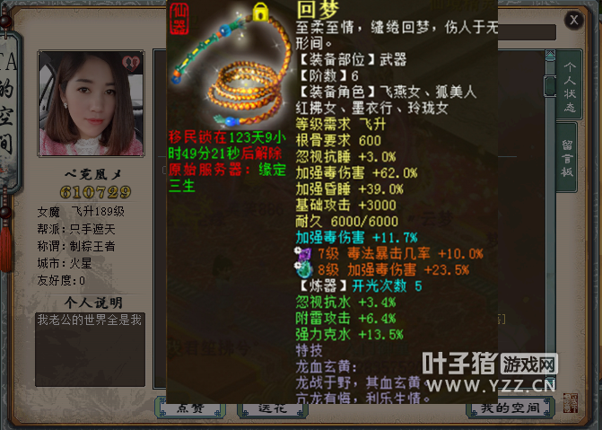 谈完以上两位红颜知己让我印象深刻的女玩家,我来红颜知己溜达一圈,的确是今非昔比了,我来捕获一些妹纸了。 觉得这个妹纸有意思,6阶毒女很少见,不过看了下她资料,已经是女魔了,估计女人确实玩不下去,哈哈,大家都懂的,来张她的照片 红颜知己ID610729:霓凰