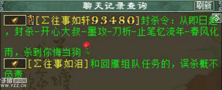 发展 次日至尊龙带队截杀 清晰6介队 诠释长情、往事家族(曾经恶人谷帮派的中流砥柱)等人,事件开始发酵。 稍晚时间清馨轩老大 最终幻想 在内部群要求:杀鸡给猴看【绿水汀 排名第二,回雁楼 乙级帮派】,意思通过封杀回雁楼,来震慑 绿水汀。 于是清馨轩当晚主力队伍 耍铃铛,封杀回雁楼,任何和回雁组队任务的、任何支持回雁楼的通杀。 有点吓人 清馨轩内部群对话